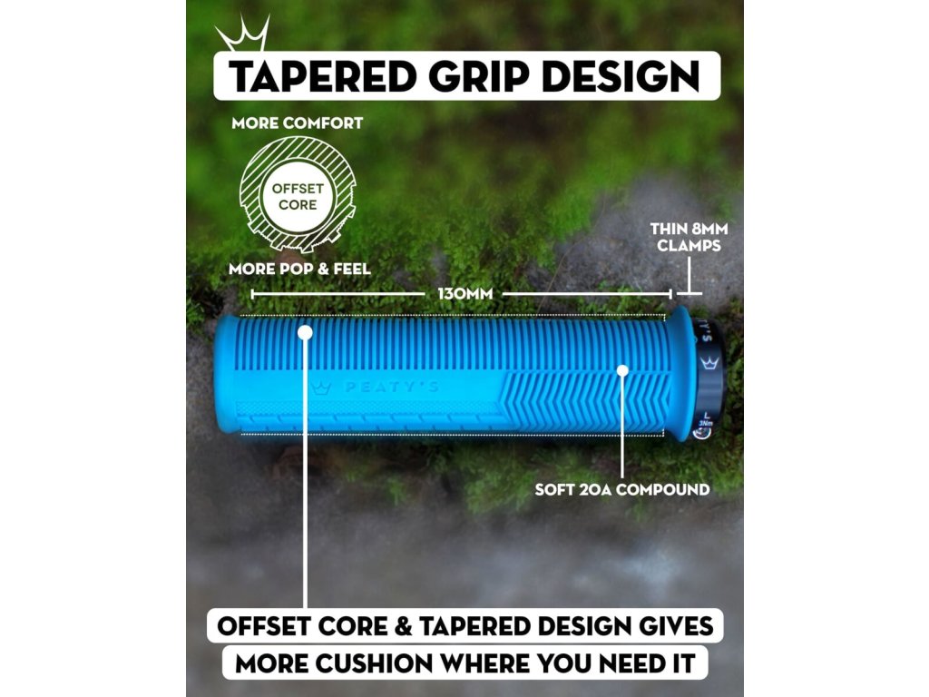 Majú kužeľovú rukoväť, ktorá zabezpečuje prirodzený úchop dlane a zaručuje pohodlie aj pri dlhých jazdách. Má offsetové jadro, kedy na vršku gripu je guma silnejšia oproti spodnej časti.